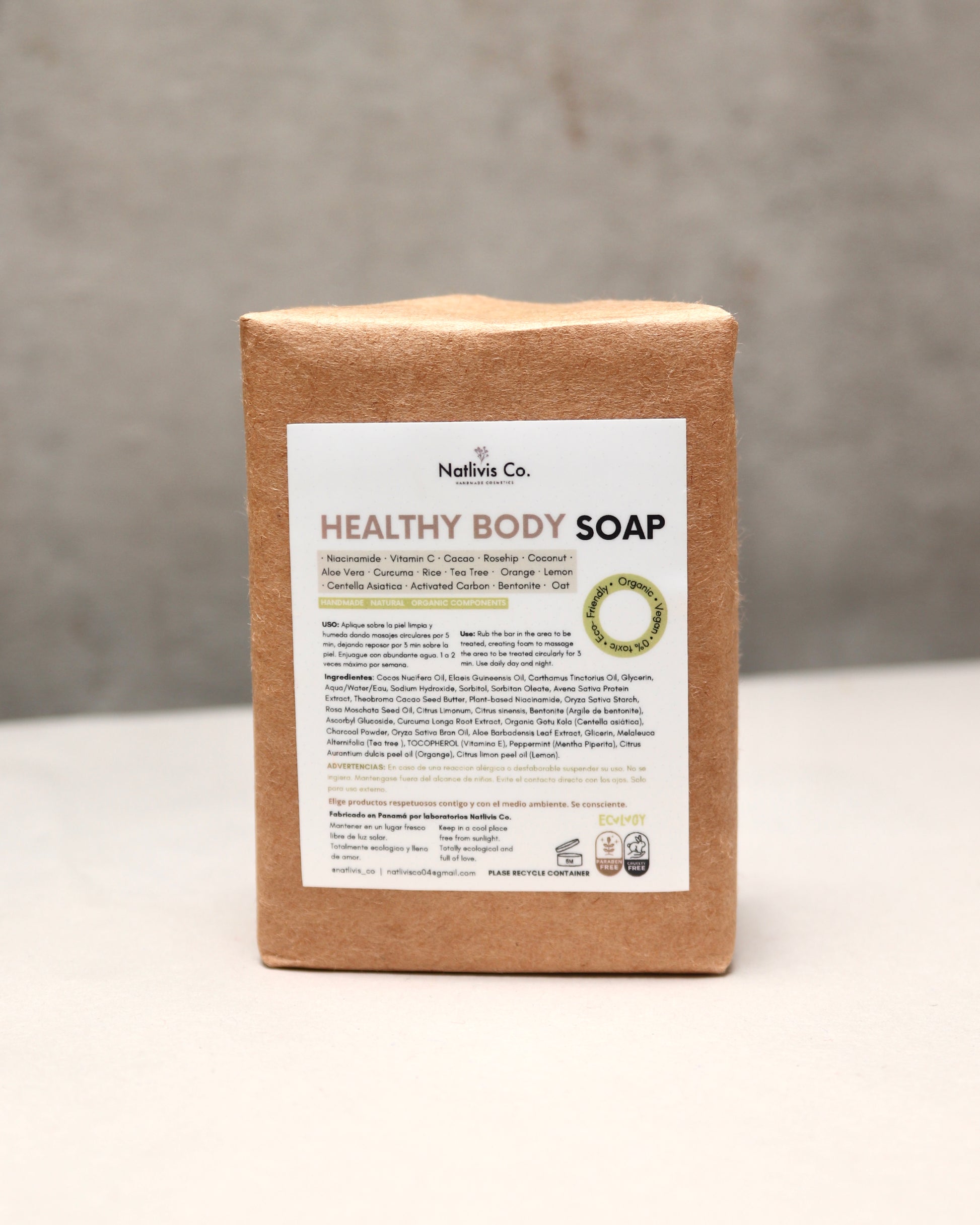 ingredientes: Cocos Nucifera Oil, Elaeis Guineensis Oil, Carthamus Tinctorius Oil, Glycerin, Aqua/Water/Eau, Sodium Hydroxide, Sorbitol, Sorbitan Oleate, Avena Sativa Ingredientes: Protein Extract, Theobroma Cacao Seed Butter, Plant-based Niacinamide, Oryza Sativa Starch, Rosa Moschata Seed Oil, Citrus Limonum, Citrus sinensis, Bentonite (Argile de bentonite), Ascorbyl Glucoside, Curcuma Longa Root Extract, Organic Gotu Kola (Centella Asiática), Charcoal Powder, Oryza Sativa Bran Oil, Aloe Barbadensis Leaf Extract, Glicerin, Melaleuca Alternifolia (Tea tree ), TOCOPHEROL (Vitamina E), Peppermint (Mentha Piperita), Citrus Aurantium dulcis peel oil (Organge), Citrus limon peel oil (Lemon).