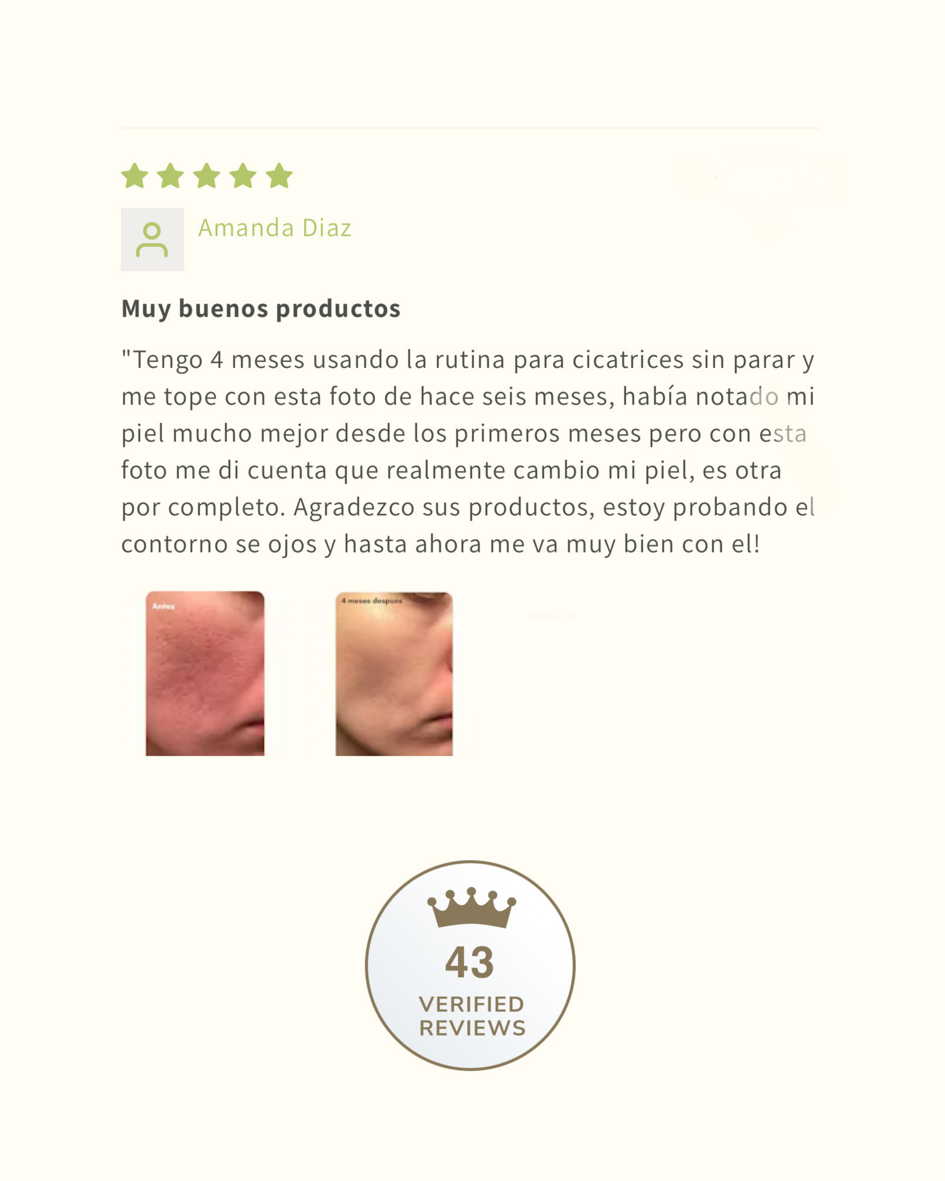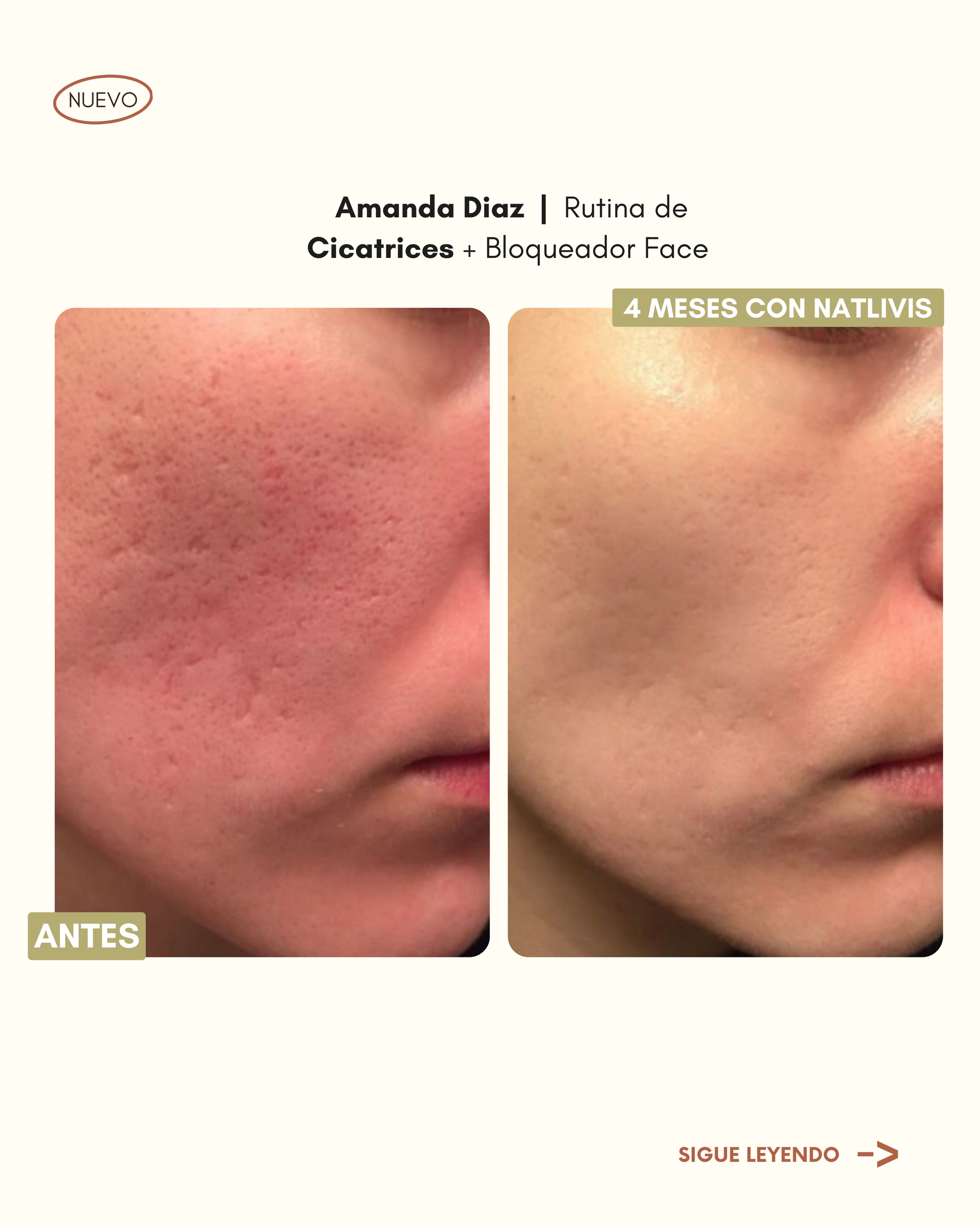 "Tengo 4 meses usando la rutina para cicatrices sin parar y me tope con esta foto de hace seis meses, había notado mi piel mucho mejor desde los primeros meses pero con esta foto me di cuenta que realmente cambio mi piel, es otra por completo. Agradezco sus productos, estoy probando el contorno se ojos y hasta ahora me va muy bien con el!