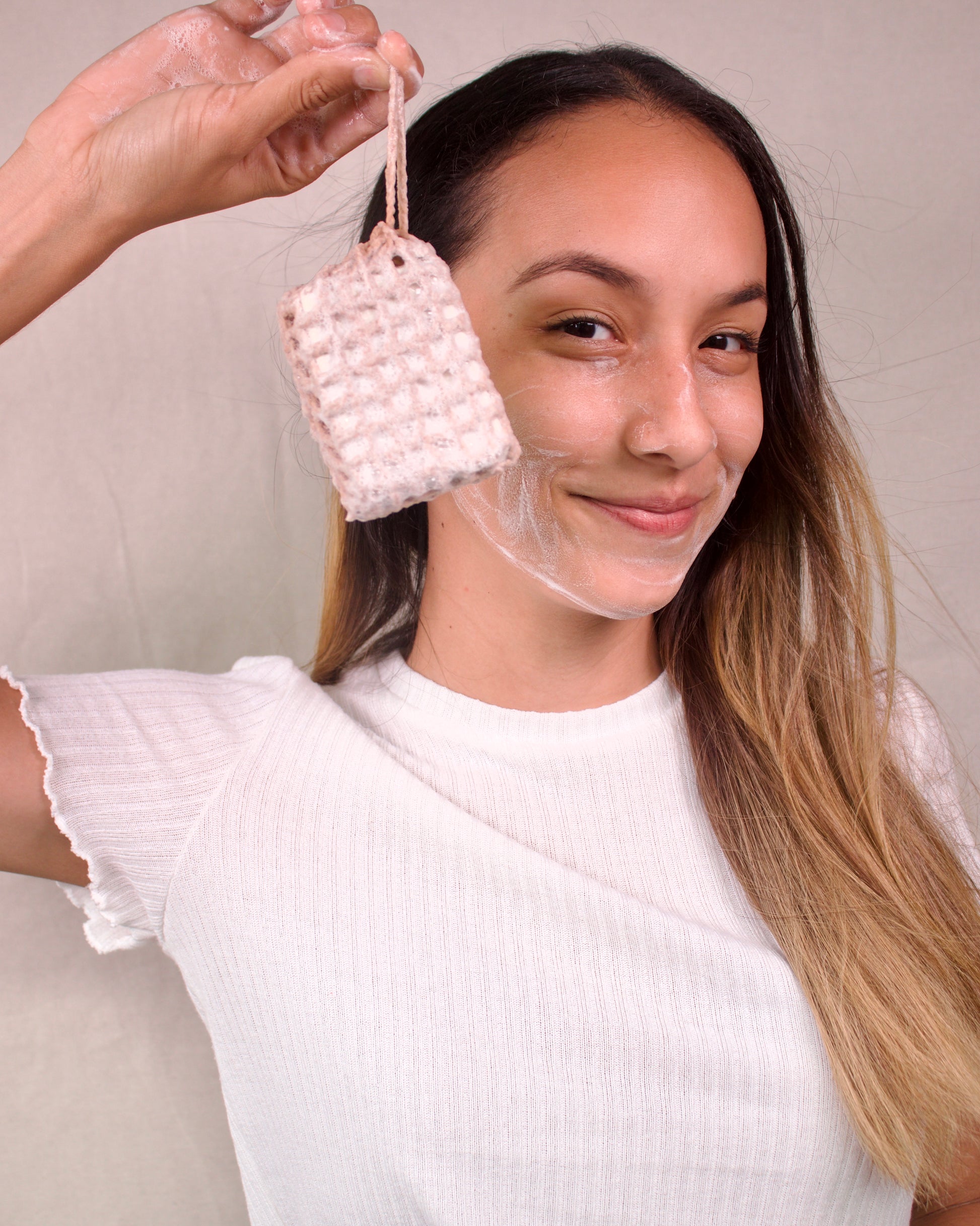 Además, también sirve como esponja exfoliante, de tacto agradable, para conseguir una piel más suave o un enjabonado más intenso. También puedes usarla para llevar de viaje o de excursión, tus jabones.