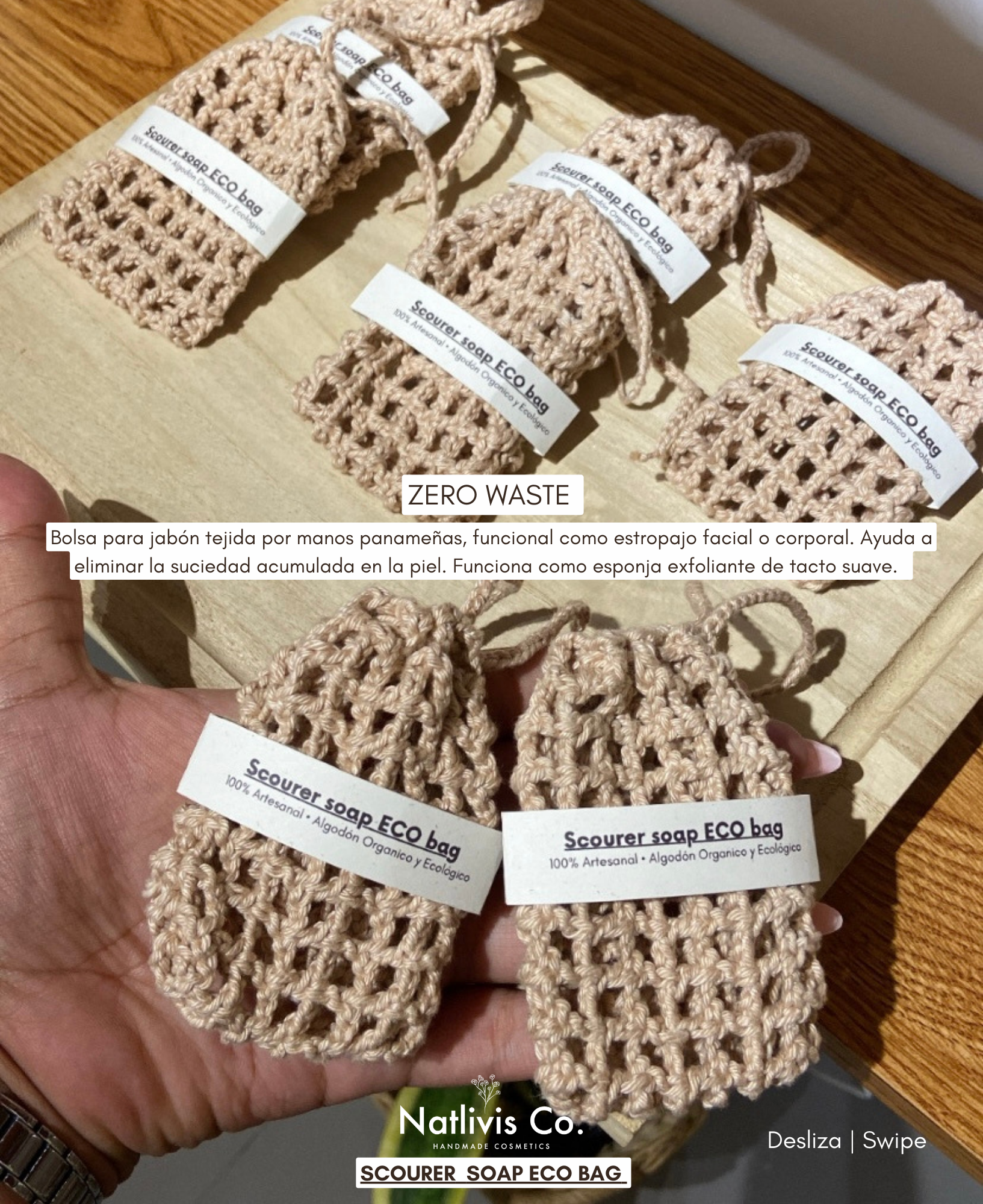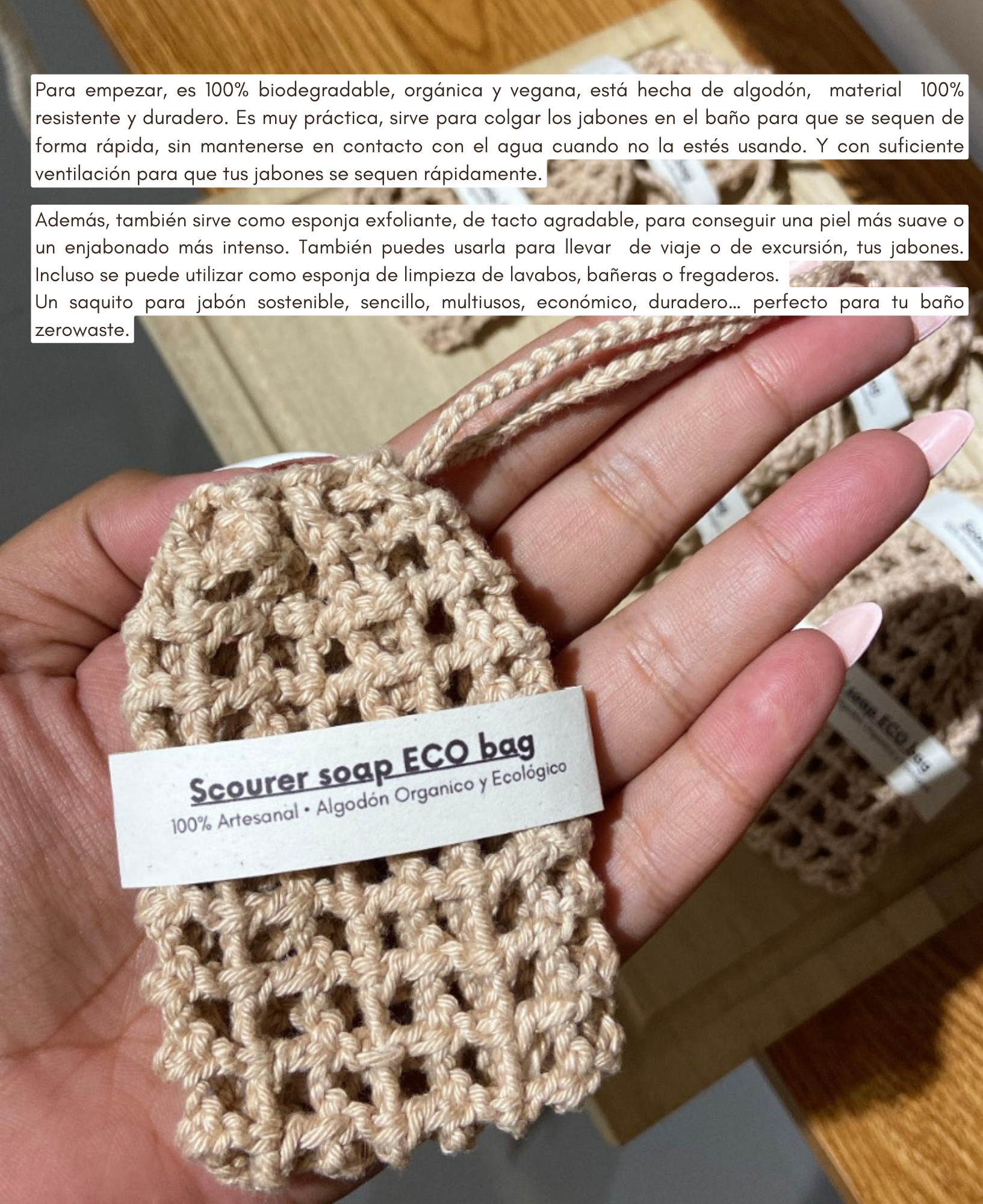 Para empezar, es 100% biodegradable, orgánica y vegana, está hecha de algodón, material 100% resistente y duradero. Es muy práctica, sirve para colgar los jabones en el baño para que se sequen de forma rápida, sin mantenerse en contacto con el agua cuando no la estés usando. Y con suficiente ventilación para que tus jabones se sequen rápidamente.