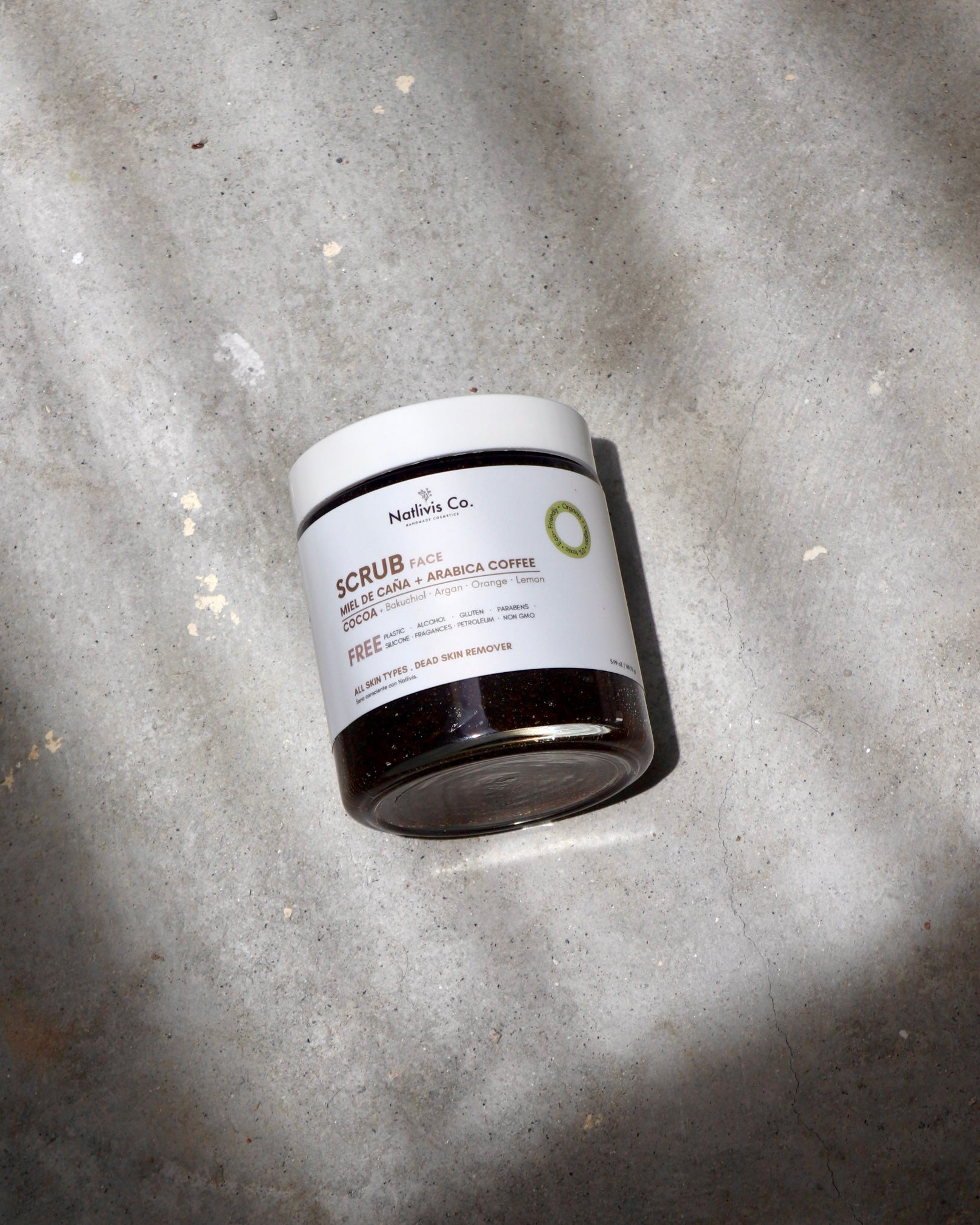 Ingredientes: Sacchaum Officinarum Extract, Coffea Arabica Seed Powder, Aloe Barbadensis Leaf Extract, Theobroma Cacao (Cocoa) Seed Powder, Bakuchiol, Argania Spinosa Kernel Oil, citrus Aurantium dulcis Peel Extract, Citrus Limon Peel Extract, Citrus Limon Peel Oil, Citrus Aurantium Dulcis (Orange) Peel Oil. TOCOPHEROL (Vitamina E).