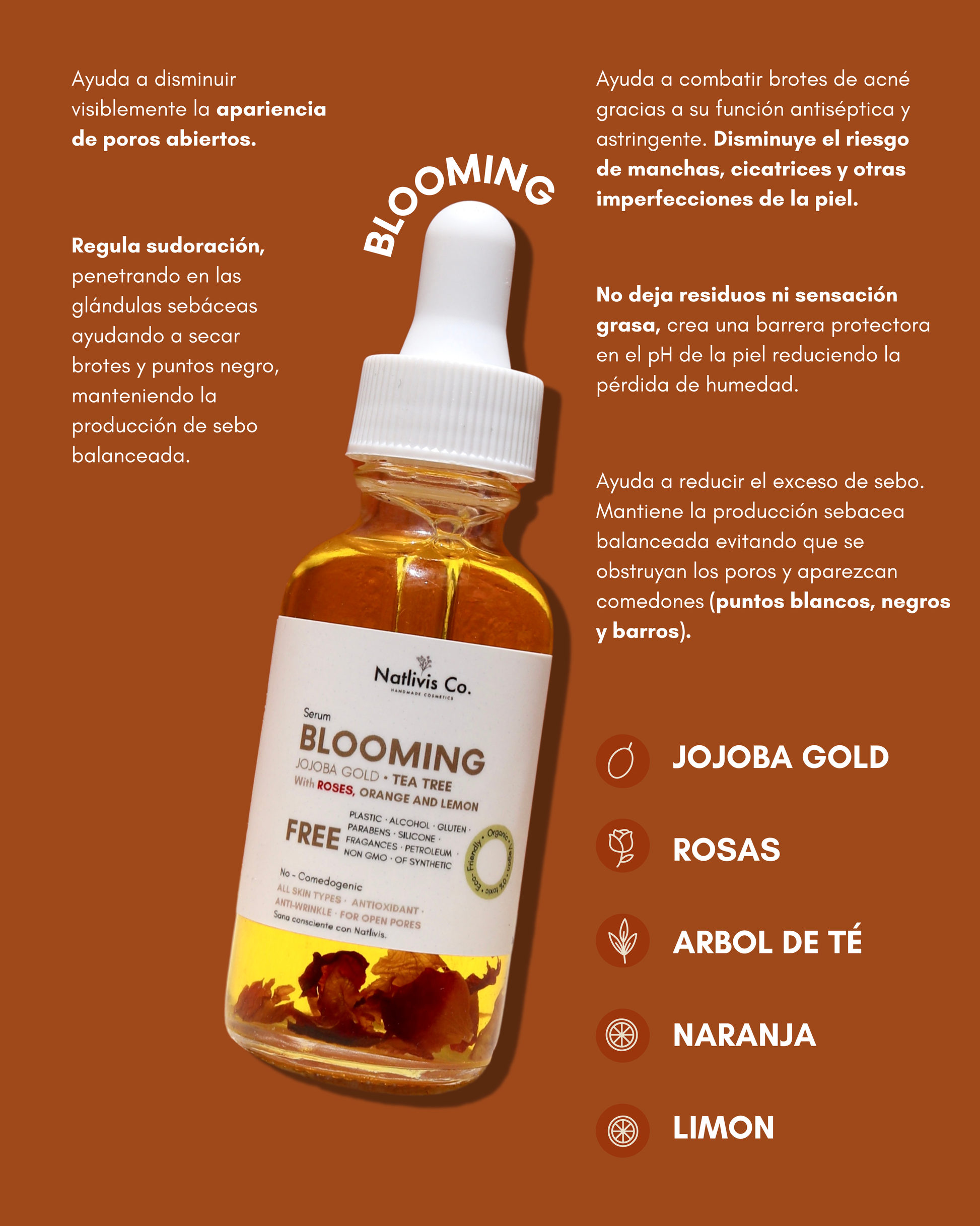 • Regula sudoración, penetrando en las glándulas sebáceas ayudando a secar brotes y puntos negro, manteniendo la producción de sebo balanceada. Gracias a su alto contenido de vitaminas antioxidantes C y E neutraliza los radicales libres.